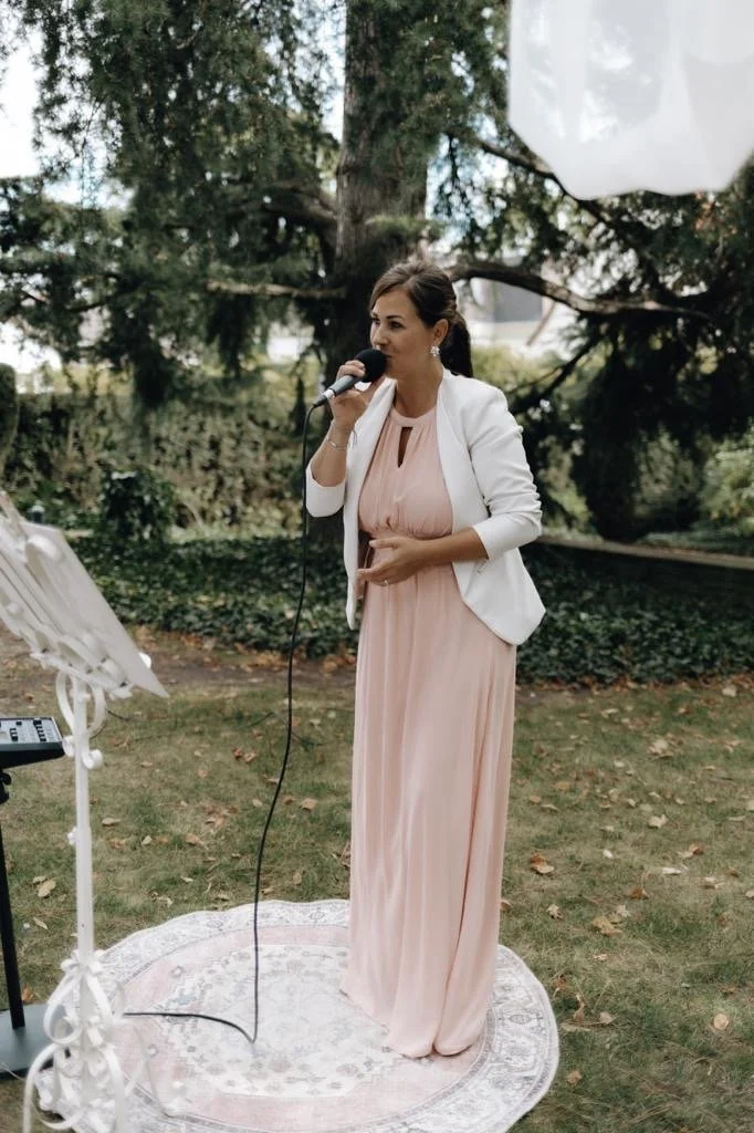 Bianca kenne ich schon seit mehreren Jahren – zuerst habe ich sie als Sängerin erlebt, später dann auch als Traurednerin. Besonders im Gedächtnis geblieben ist mir eine Hochzeit, auf der ich selbst aufgelegt habe und Bianca mit ihrer Stimme die Trauung begleitet hat. Inzwischen kombiniert sie beides – Rede und Gesang – und das ist wirklich etwas Besonderes. Stellt euch vor: Eure Traurednerin fängt während der Rede an zu singen oder begleitet euren Einzug mit einem Song, der direkt ins Herz geht. Genau dafür steht Gefühlsmoment.